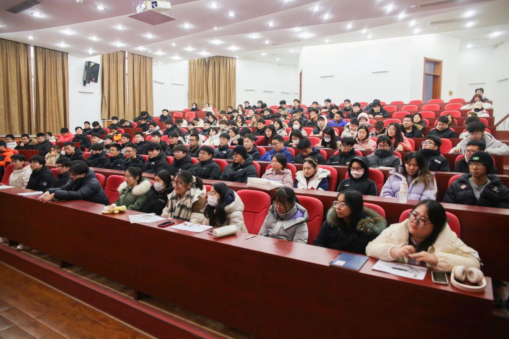 12月26日,sunbet申搏官方网站教师吕昊博士(后)和邵唐砂博士在西校园八角楼为2021级全体本科生作职业生涯规划经验分享,辅导员李炳树主持会议。