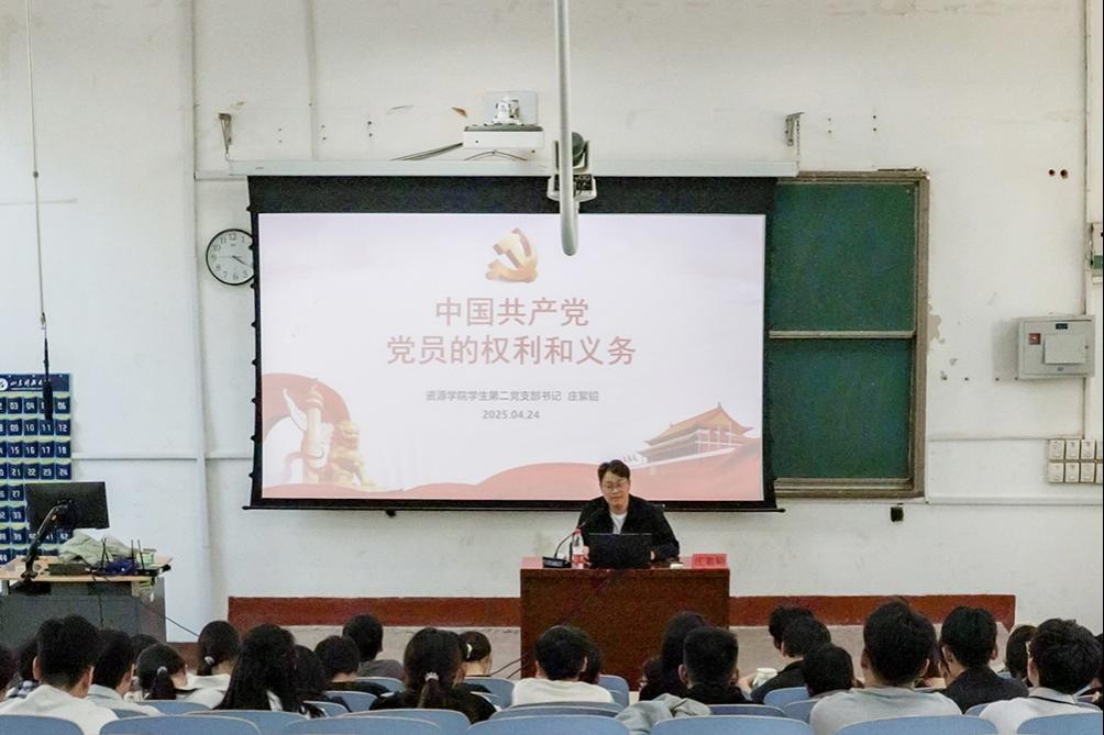 4月24日,sunbet申搏官方网站学生第二党支部书记庄絮铅在1A107为学院第42期入党积极分子讲授“中国共产党党徽党旗条例”和“中国共产党党员的权利与义务”专题党课。