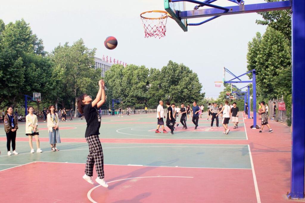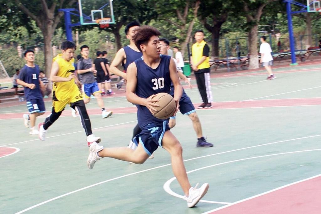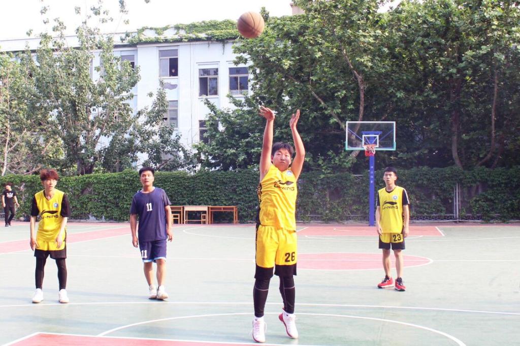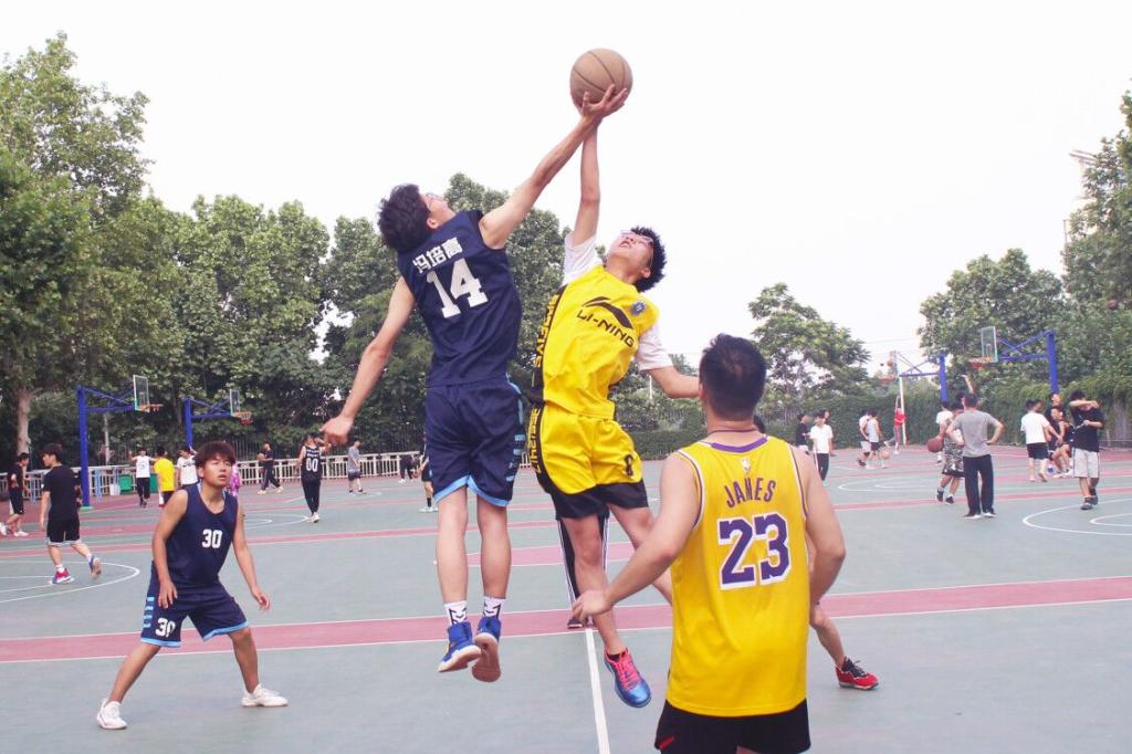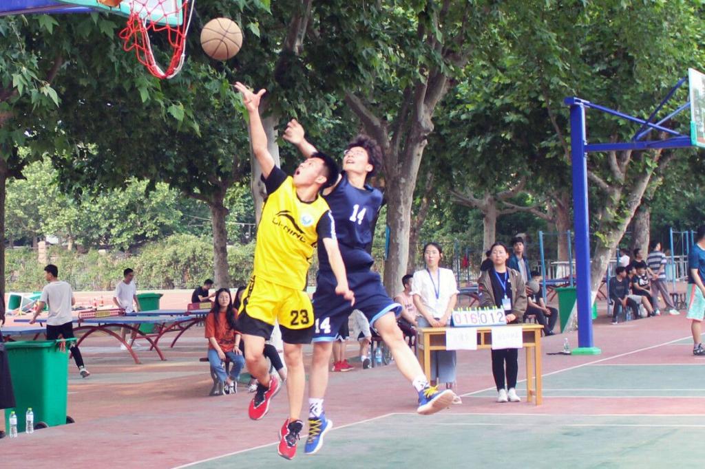 侧身投球,奋力阻挡。篮筐前两队球员不断争锋,显现球场博弈。(文:臧宇轩 图: 张慧臻)