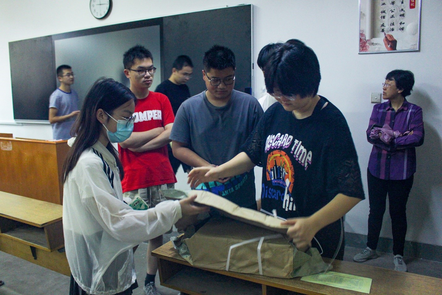 在教材发放过程中,相关负责老师下发教材清单并指导同学们做好包裹搬运、分拣、拆封等准备工作,各班级自觉排队,严格遵守流程规范进行教材的清点、核对、签字,有序领取相应教材。