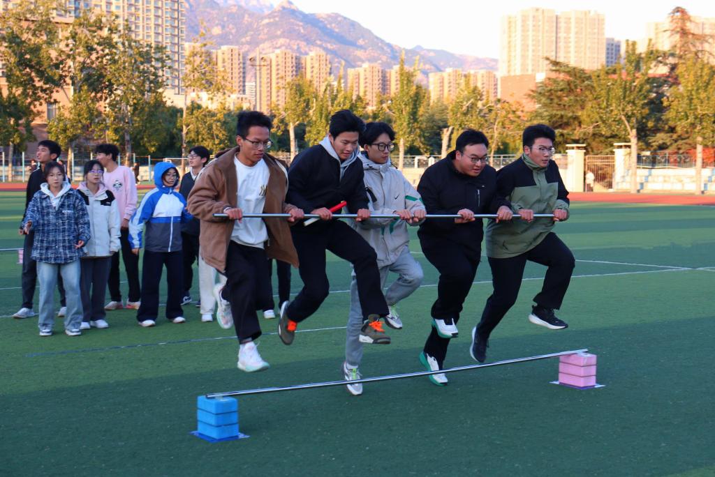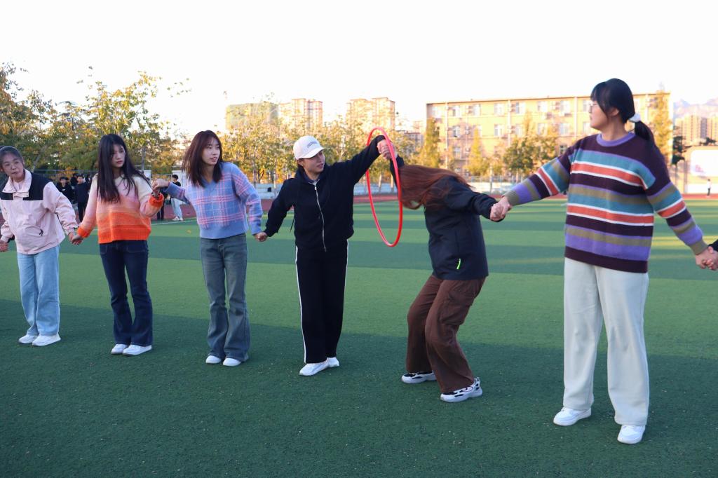第一阶段分为“十人九足”“旋风跑”“一圈到底”和“车轮滚滚”四个环节,按照累计时长进行成绩排名。在“十人九足”环节中,20名同学排成一横排,相邻两人将腿绑在一起,共同前进,同学们步伐整齐划一,在响亮的口号中稳健前行;在“旋风跑”环节中,5名同学共握一根长杆,步伐协调、紧密配合,同步跨越多重障碍,敏捷绕过立杆,彰显了身体的灵巧技艺;在“一圈到底”环节中,15名同学手拉手呈一字排开,每位同学依次通过呼啦圈,同学们密切协作、奋力传递;在“车轮滚滚”环节中,8名同学有序进入履带中,一人带动引领,其余紧密相依、协同前行,大家齐心协力、默契十足、奋勇向前,平稳完成挑战。