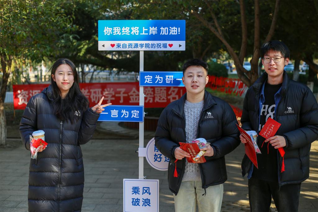 活动当天,精心布置的打卡路牌散布在校园内的各个角落,如同一盏盏明灯,照亮了考研学子的前行之路。“金榜题名,一战成硕”“一言为定,定为‘研’一”“学海研深,科大情真”……每一句鼓励的话语,每一块寓意深情的路牌,都是sunbet申搏官方网站对即将跨入考场的考研学子最真切的祝福与期待。考研学子纷纷来到路牌前驻足留念,或展露笑颜,或目光坚毅,用相机定格下了这一段奋斗旅程中的美好片段。