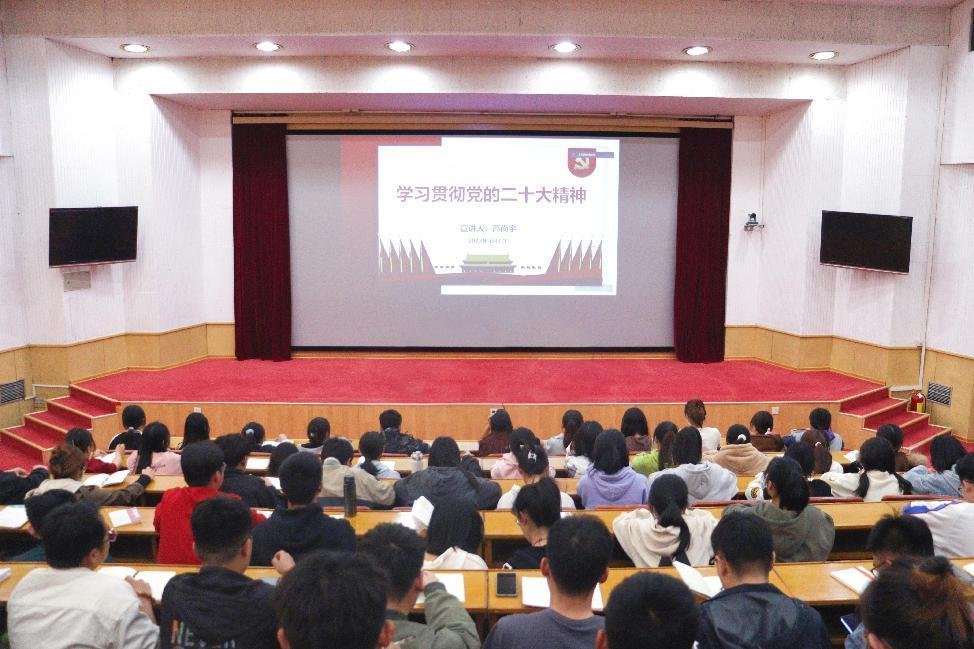 4月27日,sunbet申搏官方网站党委书记高尚宇线上讲授“学习贯彻党的二十大精神”专题党课。学院第38期入党积极分子在四号楼报告厅集体听课学习。