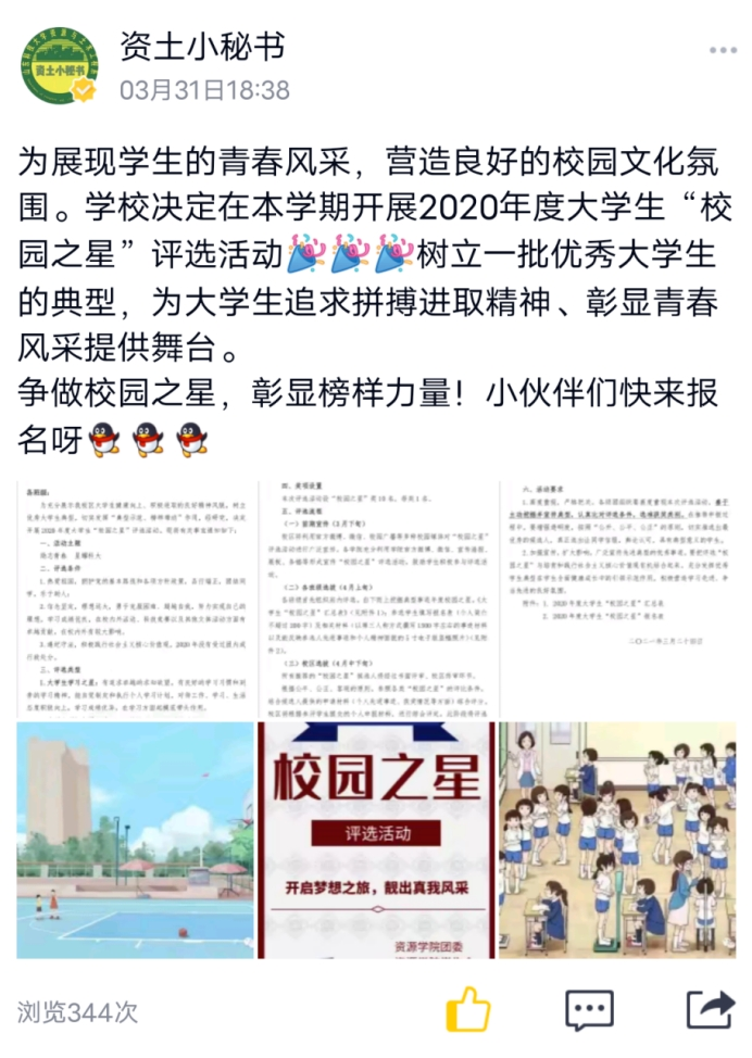 为响应校区关于开展2020年度大学生“校园之星”评选活动的通知要求,引导学院学生向榜样看齐、向先进对标,sunbet申搏官方网站大力打造“线上+线下”融媒体阵地,让评选活动宣传工作全面覆盖到学院学生群体中。