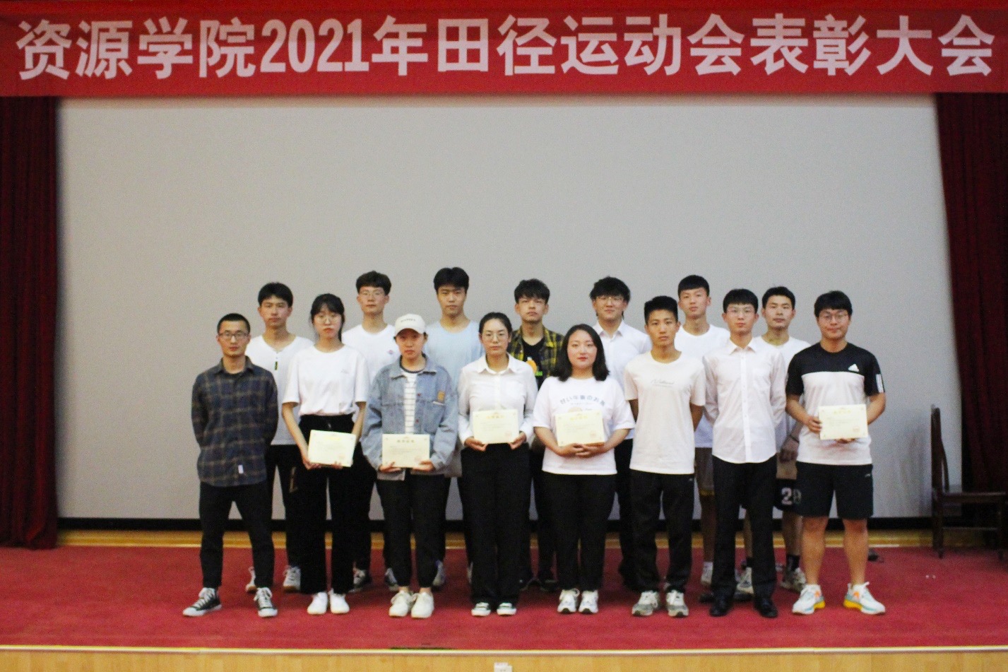 5月25日,sunbet申搏官方网站在四号楼报告厅召开2021年田径运动会表彰大会。学院党委副书记兼副院长程家国、团委书记洒艳、学院辅导员张运忠、卢业美、学生会负责人姜自健出席大会。会议由学院辅导员王淦主持,学院运动员代表与学生代表参会。