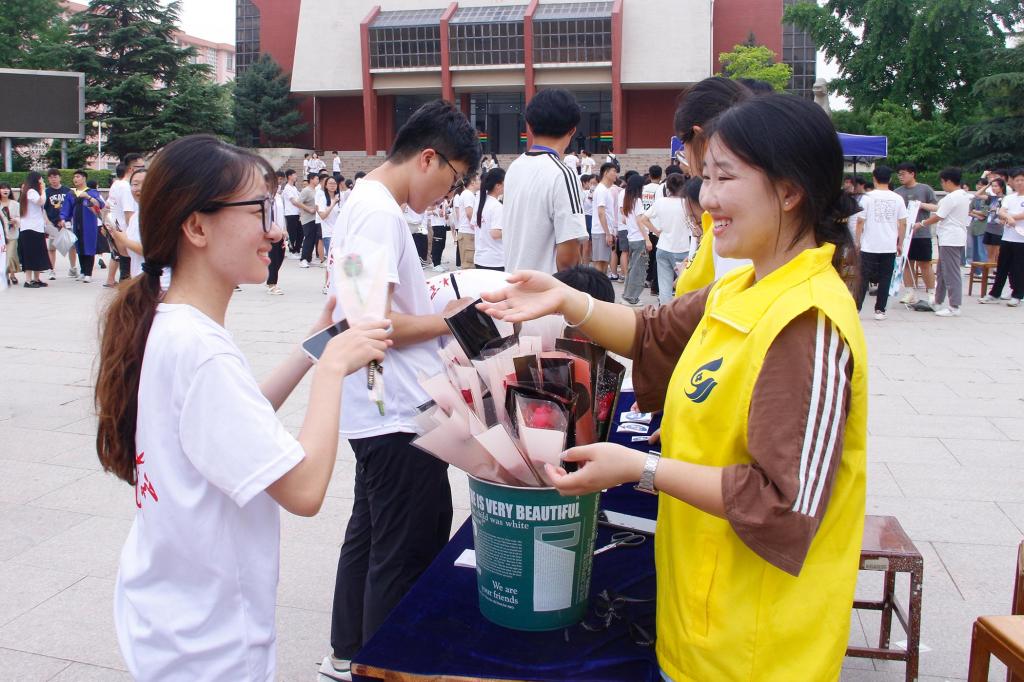 学院学生会工作人员将含苞待放的玫瑰,用精美的包装纸包装成束,意寓诚挚的祝愿与期望,送给每一位毕业生。另一场地,毕业生绘制专属笑脸,或莞尔,或开怀,将快乐与自信尽情展现在画板之上,为毕业离场写下最靓丽的一笔。一束束鲜花,一幅幅画卷,饱含了学院对毕业生“一花相伴,一路繁花”的殷切期望和衷心祝愿。