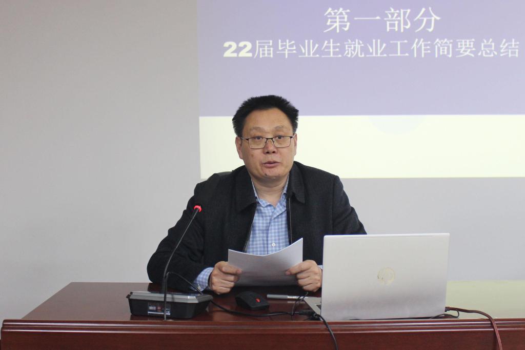 王清标从2022届毕业生就业工作总结、2023届毕业生就业工作现状、已开展的工作、下一步工作任务等四个方面,总结了学院2022届毕业生就业工作,分析了2023届毕业生就业工作面临的新形势、新挑战、新要求,回顾了前期开展的工作,部署了今后重点工作任务。