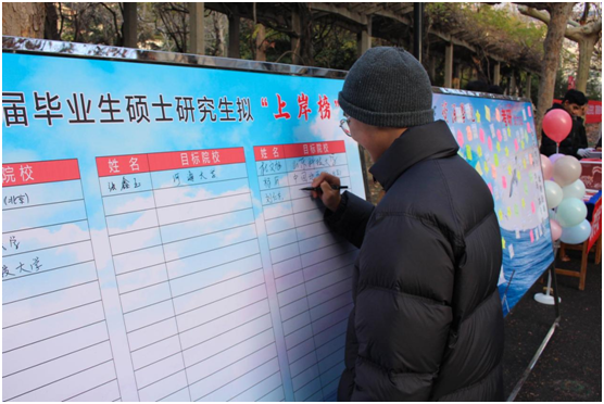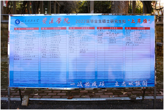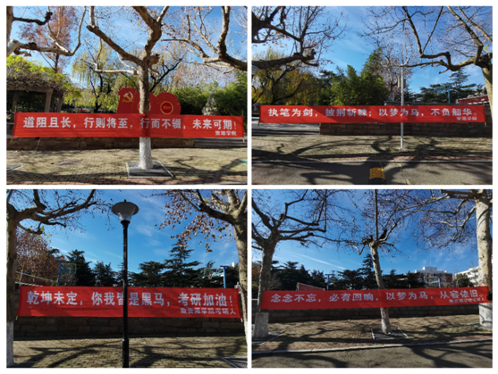 “道阻且长,行则将至”“以梦为马,不负韶华”“天道酬勤不负众望,锦鲤附体满载而归”……林荫道、行路旁,一句句祝福印在横幅,更映在心中。资源师生为考研学子条幅签名,将无限祝福浓缩镶刻在字里行间。