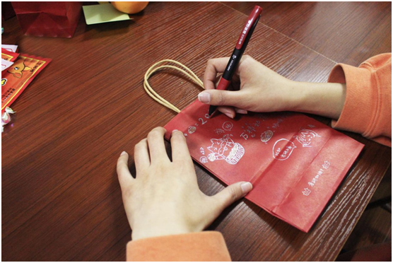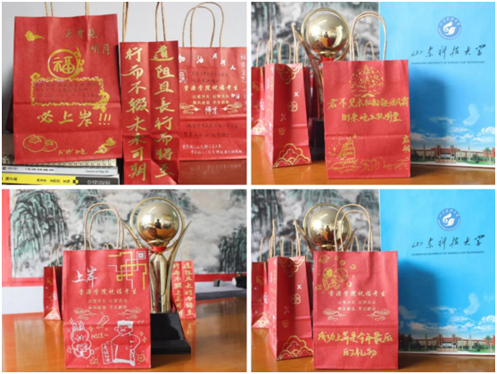 可爱的卡通人物、优雅的艺术字体、驰骋的骏马、扫描二维码就能获取的祝福视频、一行行诗意满满的滚烫文字……一笔一划都是心意、一字一句承载祝福,一项项饱含深情的元素都被学弟学妹们镶刻在了这个小小的福袋上。
