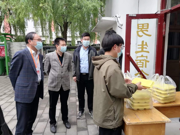 高尚宇、王清标一行向同学们表达了关心与问候,细致察看了宿舍楼配餐、送餐、物资供给、管控措施落实情况,详细了解了人员值守、后勤服务、场所消杀等情况。高尚宇对现场工作人员提出要求:一要时刻绷紧疫情防控这根弦,高质量做好服务保障工作;二要做好思想引导、心理疏导和政策解释工作;三要切实履职尽责,把疫情防控工作落细落实落到位,确保健康监测安全有序、严密有效。王清标表示,大家要坚持以人为本,加强对健康监测学生的人文关怀,在严格落实疫情防控措施的同时,全方位做好线上教育管理、毕业设计和后勤服务工作。(文:李雅娜 图:杨志浩)