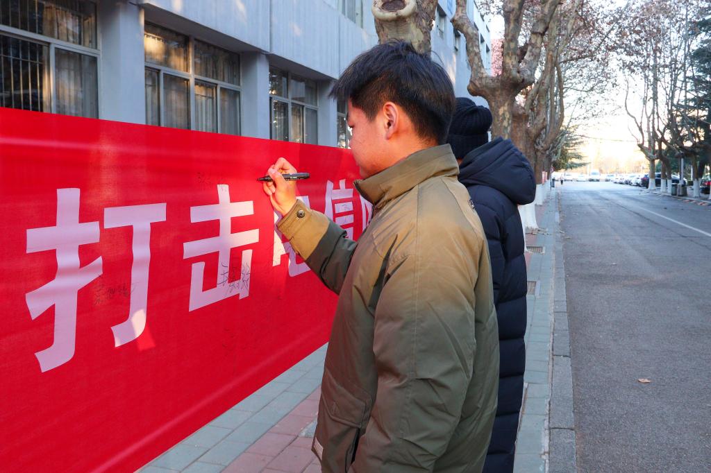 通过悬挂“打击电信网络诈骗,共建和谐美好社会”等条幅,学生会工作人员现场讲解电信网络诈骗的作案手法和识别、防范方法,告诫同学要做到“不听、不信、不转账、不汇款”。同学纷纷在条幅上郑重签字,进一步增强自我防范意识,提高防骗识骗能力。各班级组织开展签署防范电信网络诈骗承诺书,承诺从自身做起,抵制电信诈骗,共同维护校园安全。