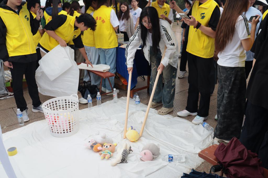 在精心布置的夹玩偶活动区域,毕业生们手持长筷,全神贯注。每一次筷子的起落,都牵动着欢声笑语与屏息凝神。既有手法娴熟者沉稳自信,精准锁定目标玩偶;也不乏初次尝试者,在一次次挑战中展现着锲而不舍的精神。小小的失误与成功的喜悦交织,紧张的情绪在轻松友好的氛围中悄然融化,化作了青春画卷上最俏皮灵动的注脚,为这个毕业季留下了难忘的温暖记忆。